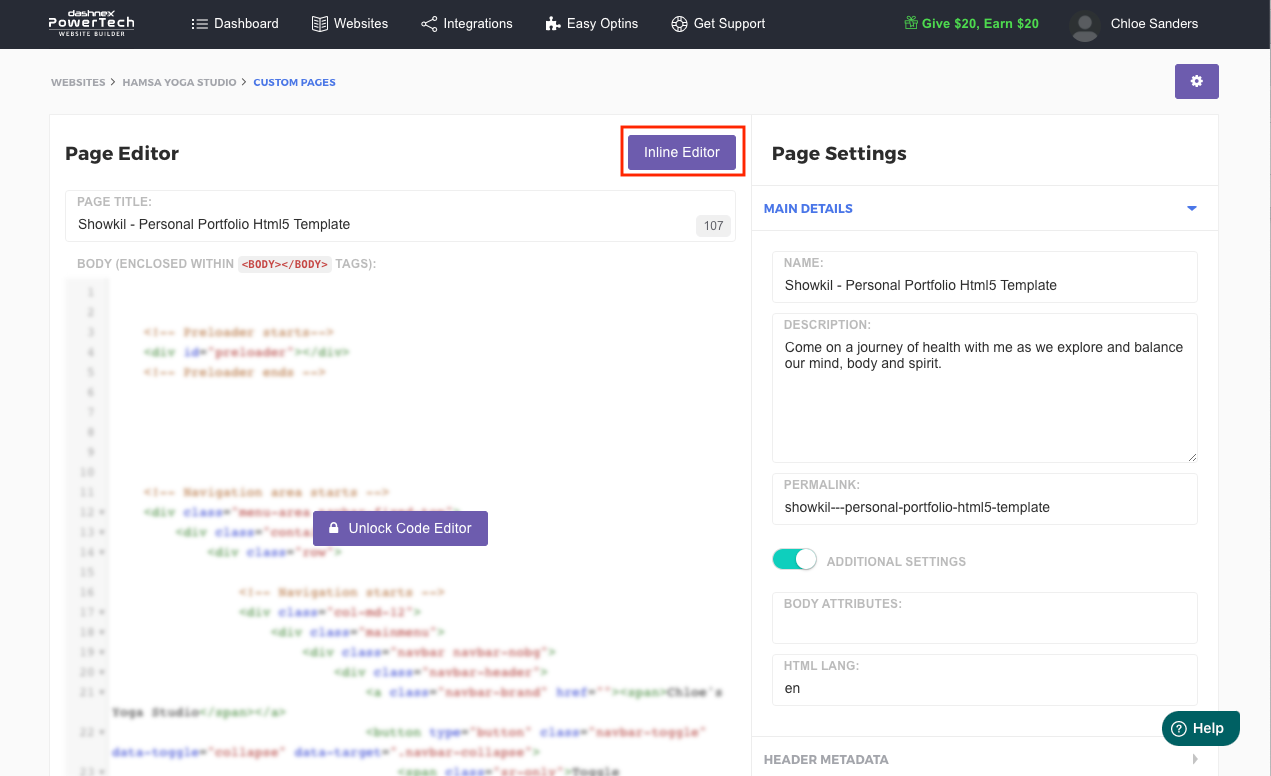 Allows you to edit the components and elements of an uploaded template within the HTML code. Choosing to edit the code from the inline editor page guide you to the appropriate location by highlighting a portion of text or element(s) within the code.