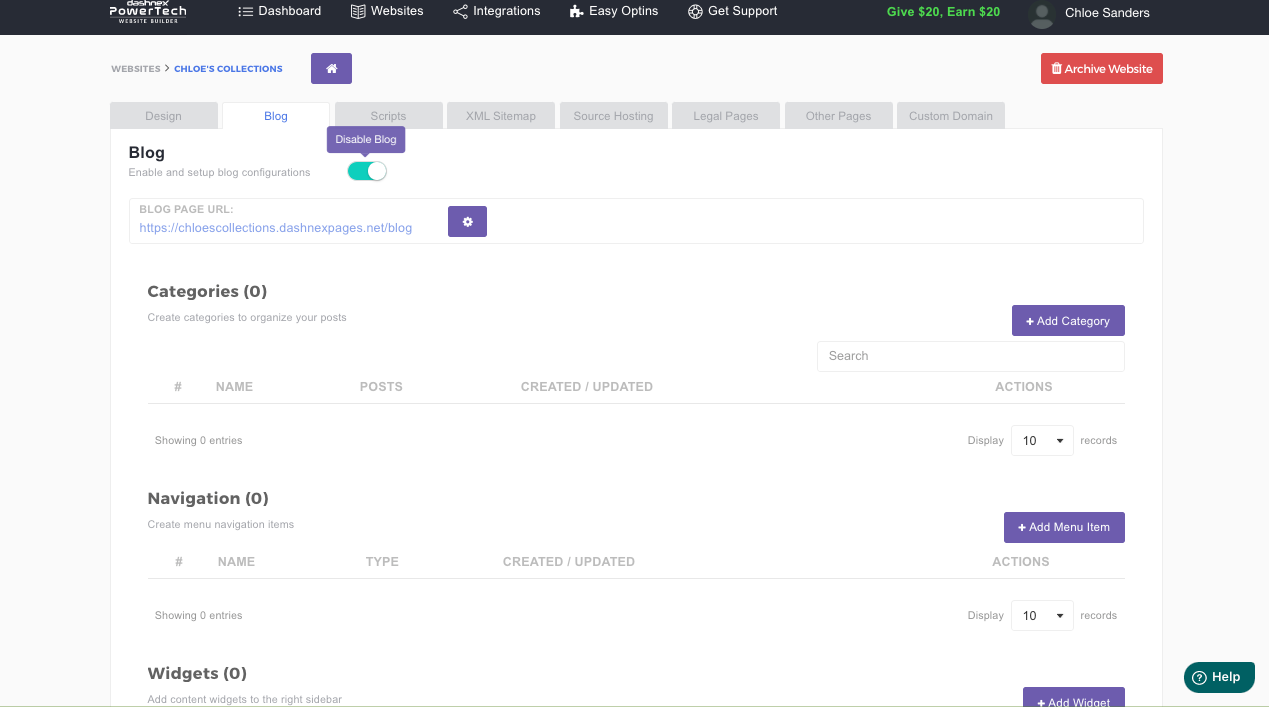 From the Blog tab within the user’s subdomain settings, users can configure categories, authors, navigation and widgets. Users can create unlimited categories (that posts can be assigned to), unlimited navigation, and a few types of widgets. The widgets include: text widgets (for simple text or HTML), recent post widget (that displays snippets of the last 7 blog posts) and a category widget (that displays all created categories).