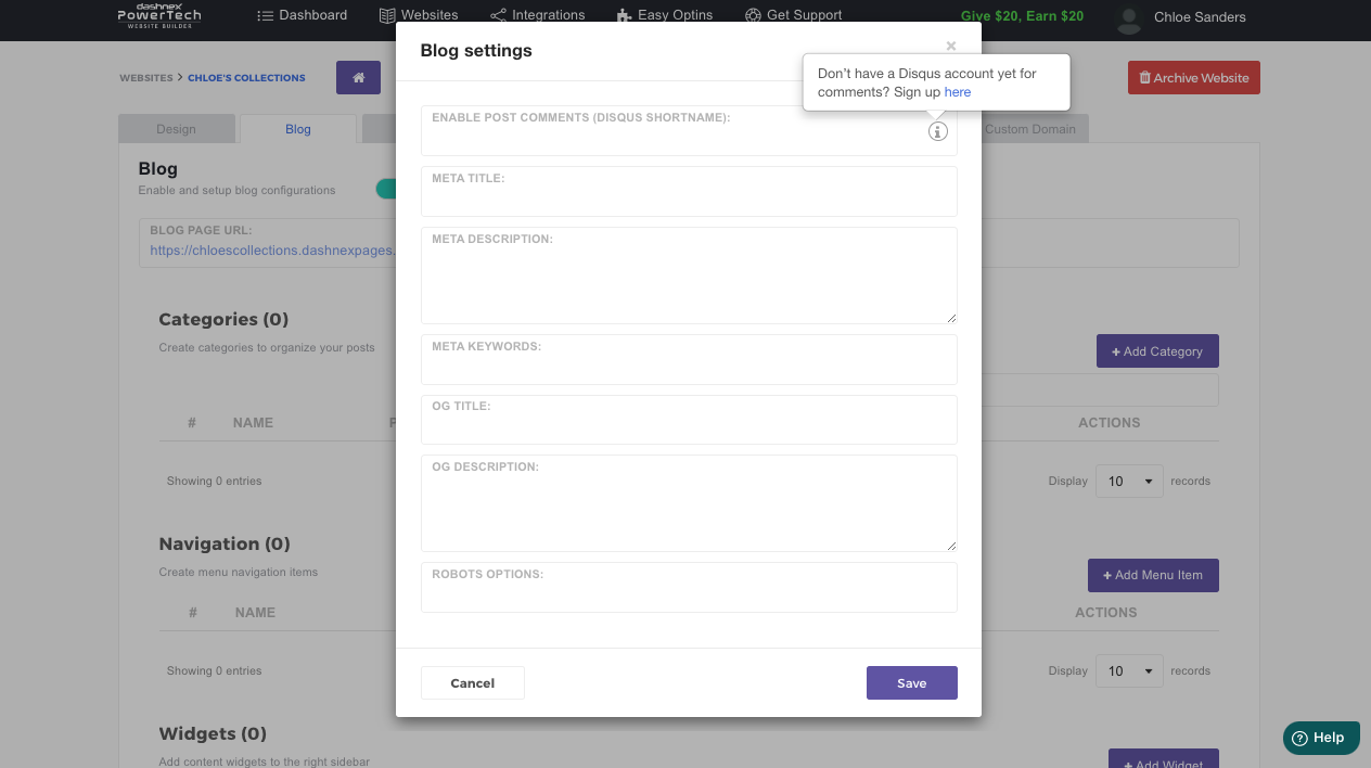 Within the Blog settings, users can enable Disqus comments and connect their free Disqus account if they would like comments to be displayed on their blog from readers which can then be managed from their Disqus account.