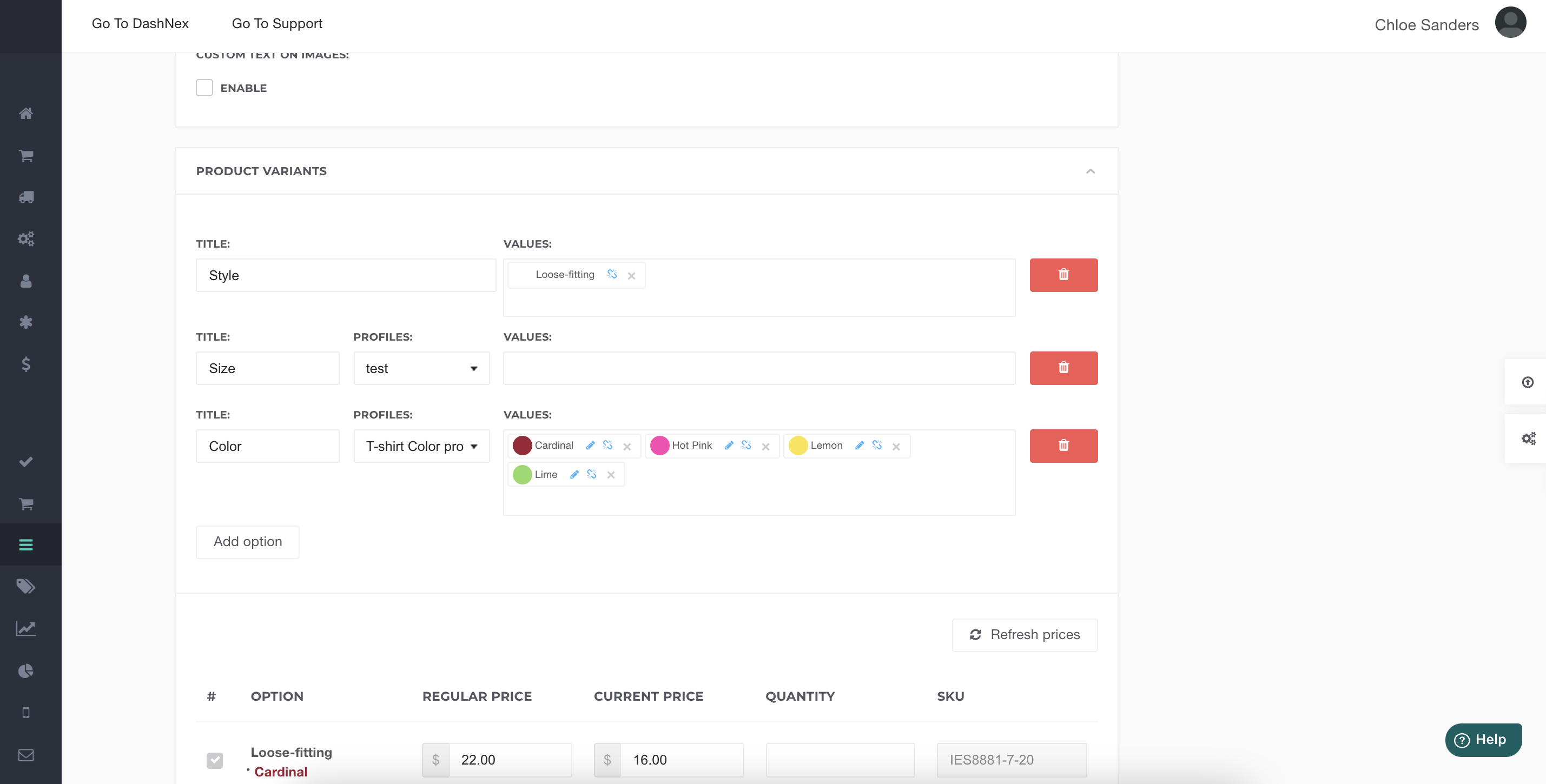 Once a color profile is added to a particular product, users can edit the profile (add/remove colors) without affecting the pre-set profile created from the Properties dashboard. Users can also link their product images to their colors for further reference.
